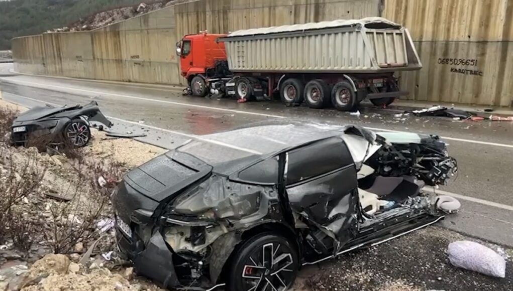 Siç shihet në foto, një prej makinave është dëmtuar aq rëndë sa është ndarë pothuajse më dysh, duke treguar fuqinë e përplasjes.