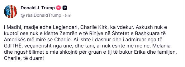I Madhi, madje edhe Legjendari, Charlie Kirk, ka vdekur. Askush nuk e kuptoi ose nuk e kishte Zemrën e të Rinjve në Shtetet e Bashkuara të Amerikës më mirë se Charlie. Ai ishte i dashur dhe i admiruar nga të GJITHË, veçanërisht nga unë, dhe tani, ai nuk është më me ne. Melania dhe ngushëllimet e mia shkojnë për gruan e tij të bukur Erika dhe familjen. Charlie, të duam!