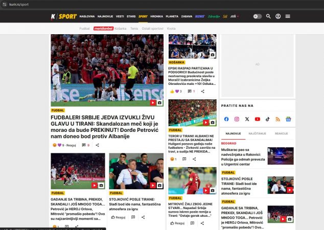 Mediat serbe kane egzagjeruar deri dhe mashtruar me titujt për lajmet e ndeshjes së sotme në Tiranë, në përballjen Shqipëri-Serbi, me rezultatin 0-0.Kurir e ka pasqyruar të gjithë ndeshjen me termat “terror, skandal, po na sulmojnë lojtarët tanë”.